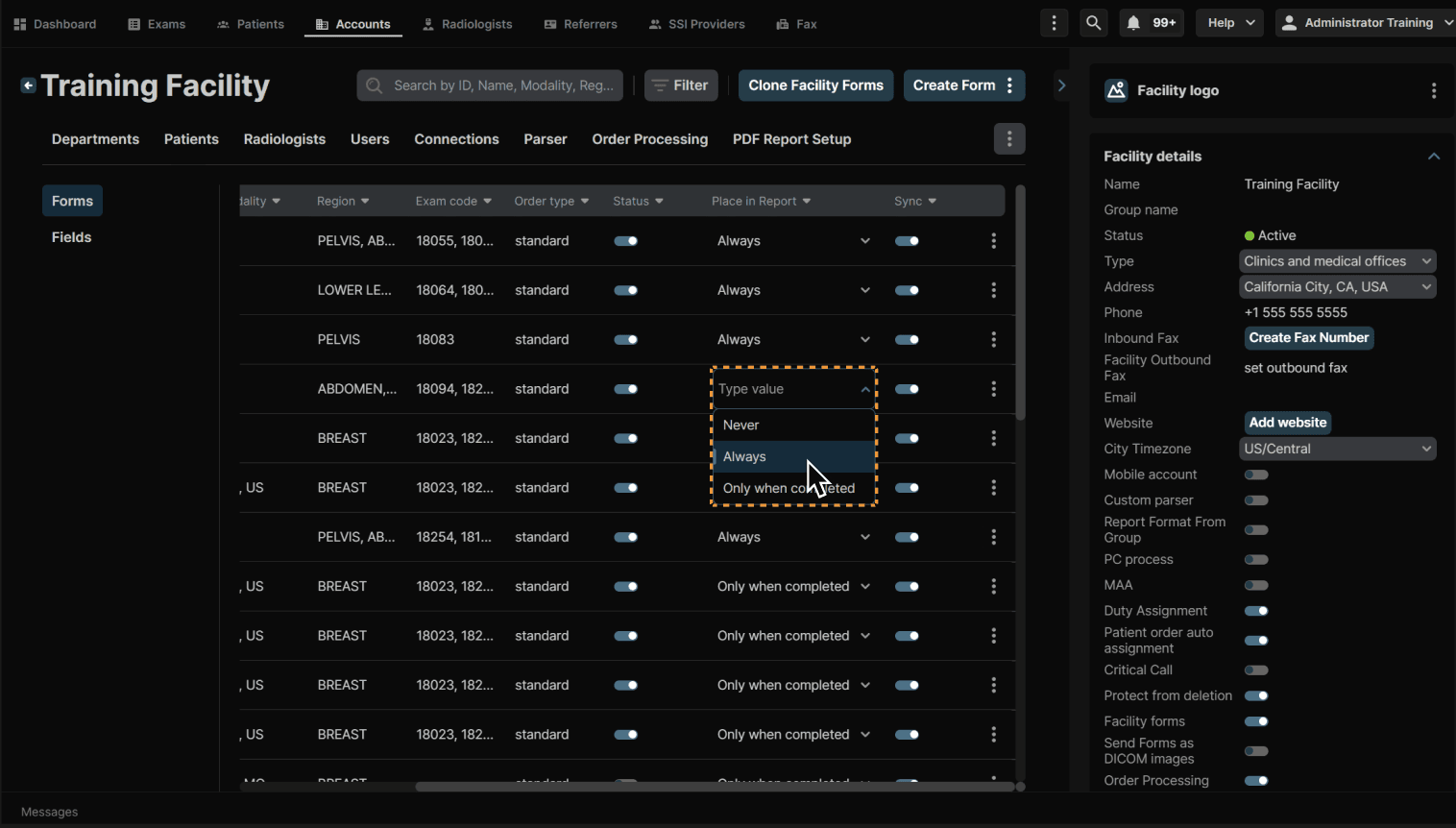 Click the dropdown under Place in Report to change when the form appears in the report. You have the options of Never, Always and Only when completed. | |