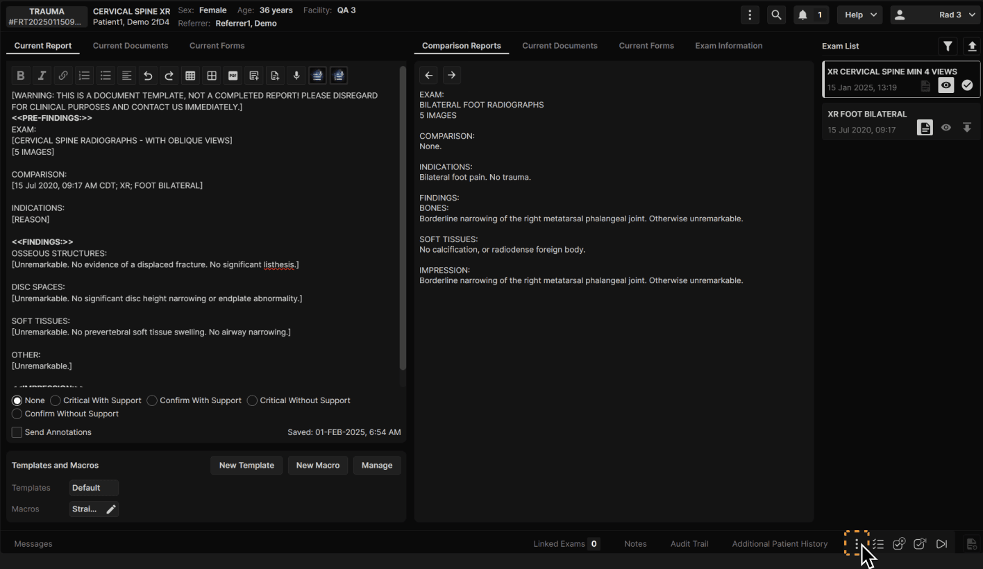 Click the three dots at the bottom of the Reporting Screen to access all exam actions. | |