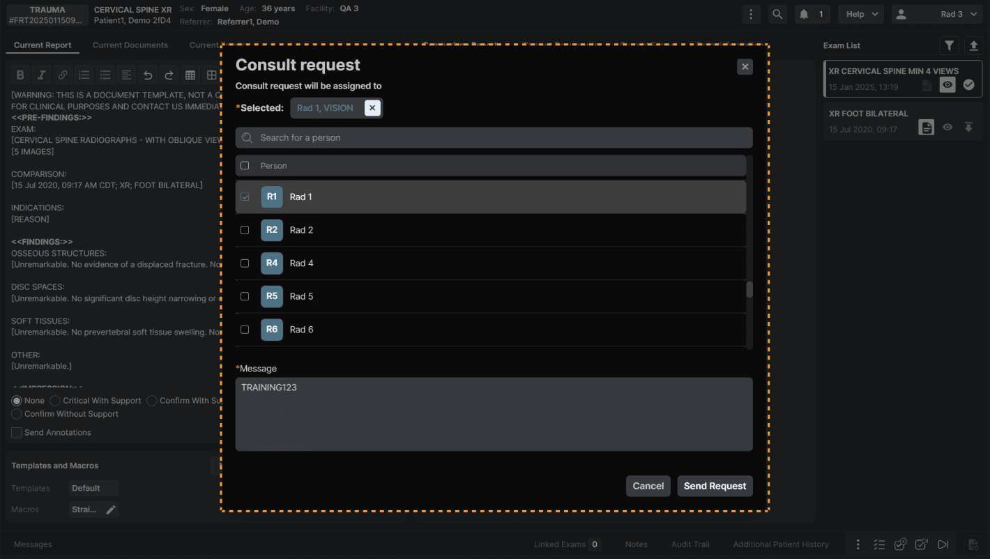 Select a recipient/recipients for the consult request and add a message if necessary. Click “Send Request” when complete. | |