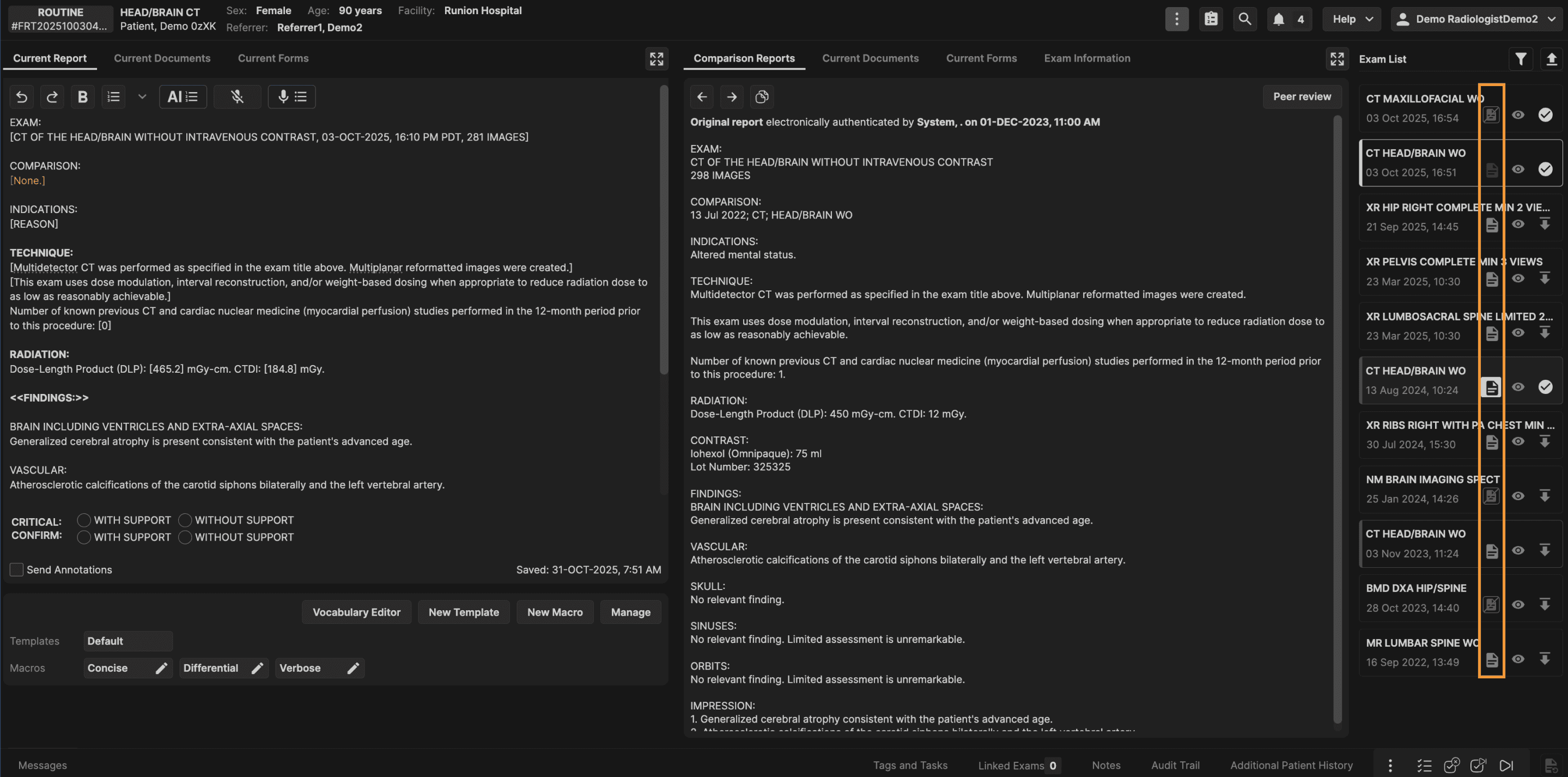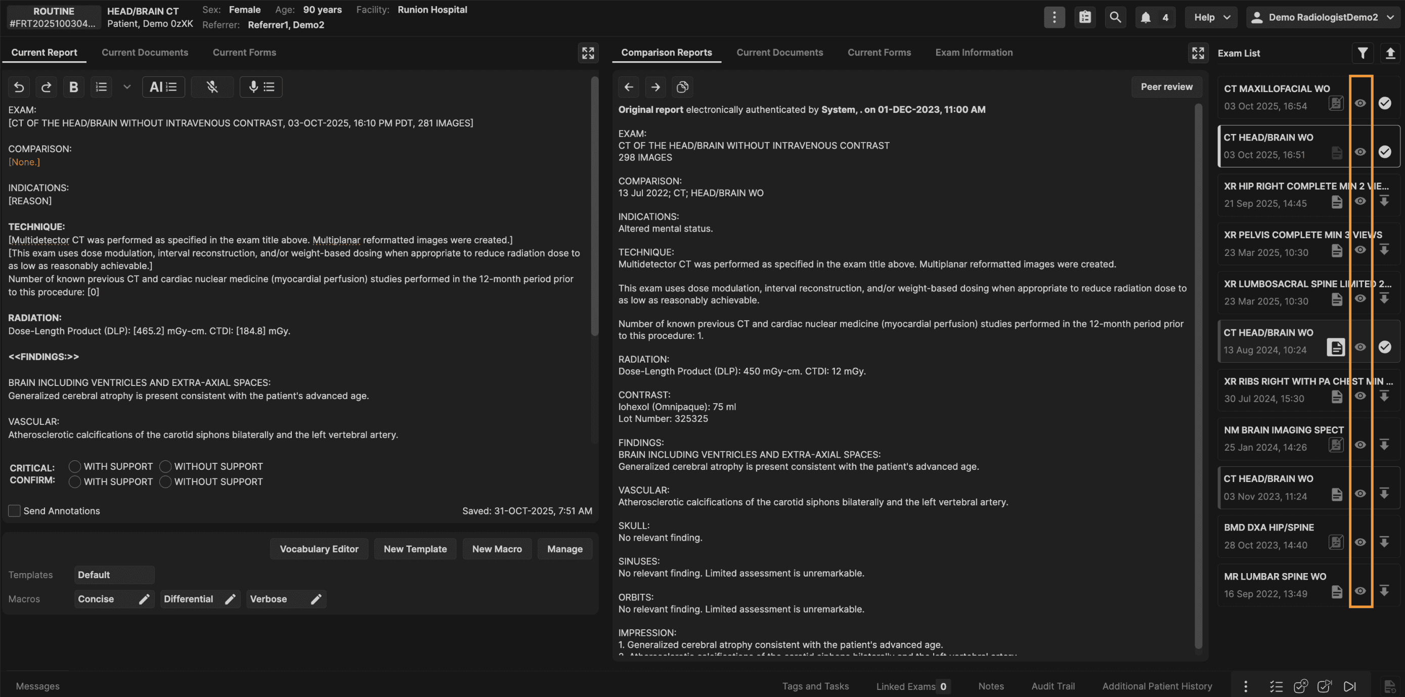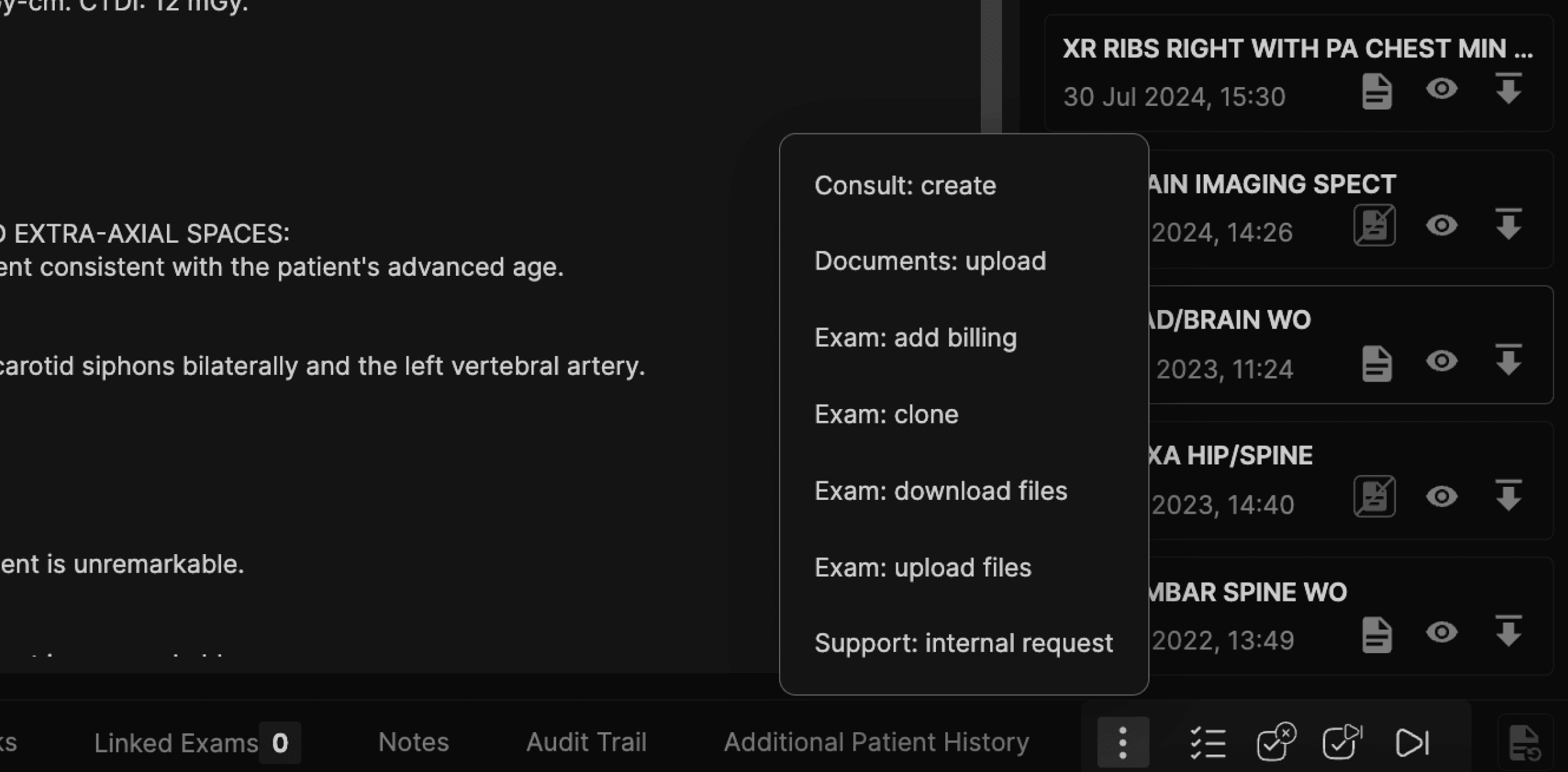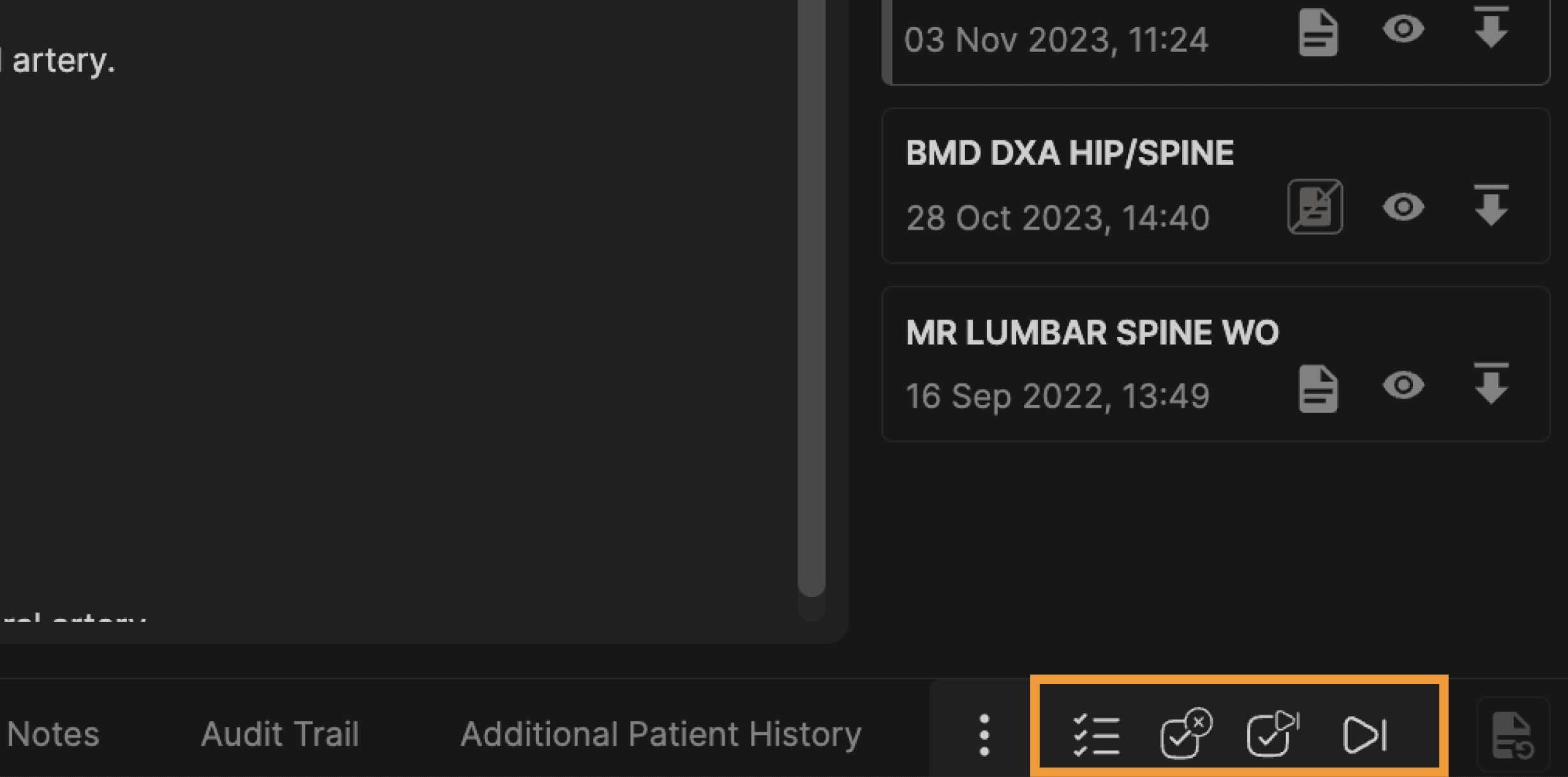 The Exam List panel is located on the right hand side of the reporting screen. The Exam List panel displays all prior exams for the current patient. | |