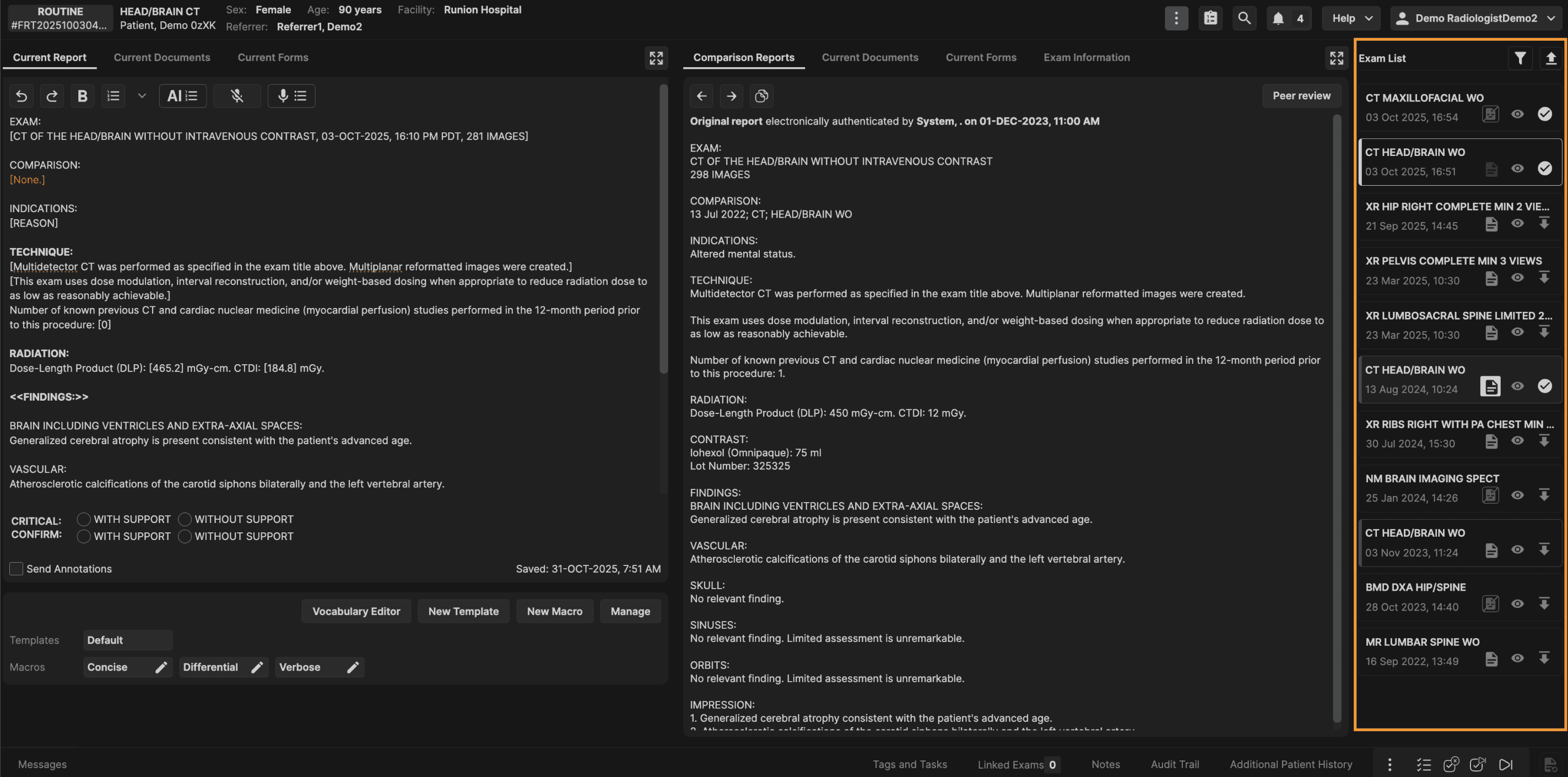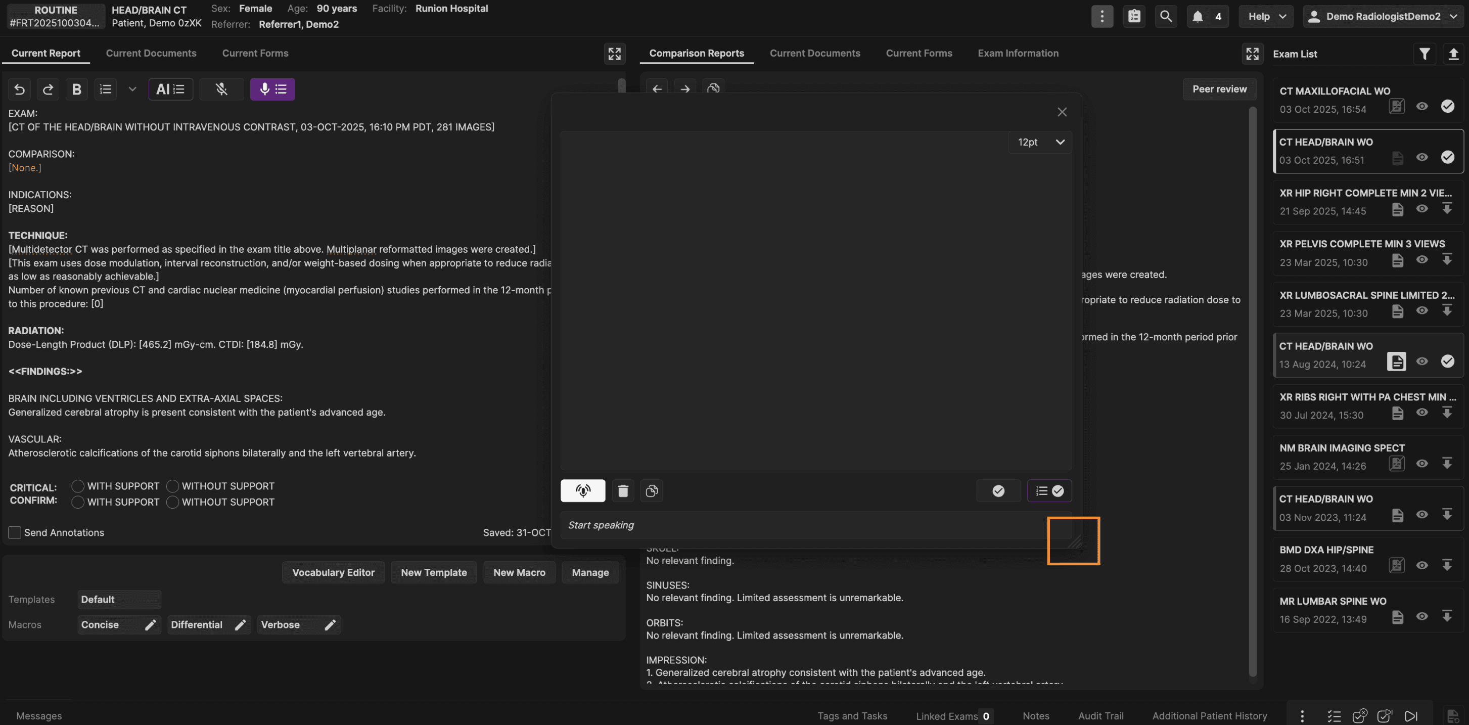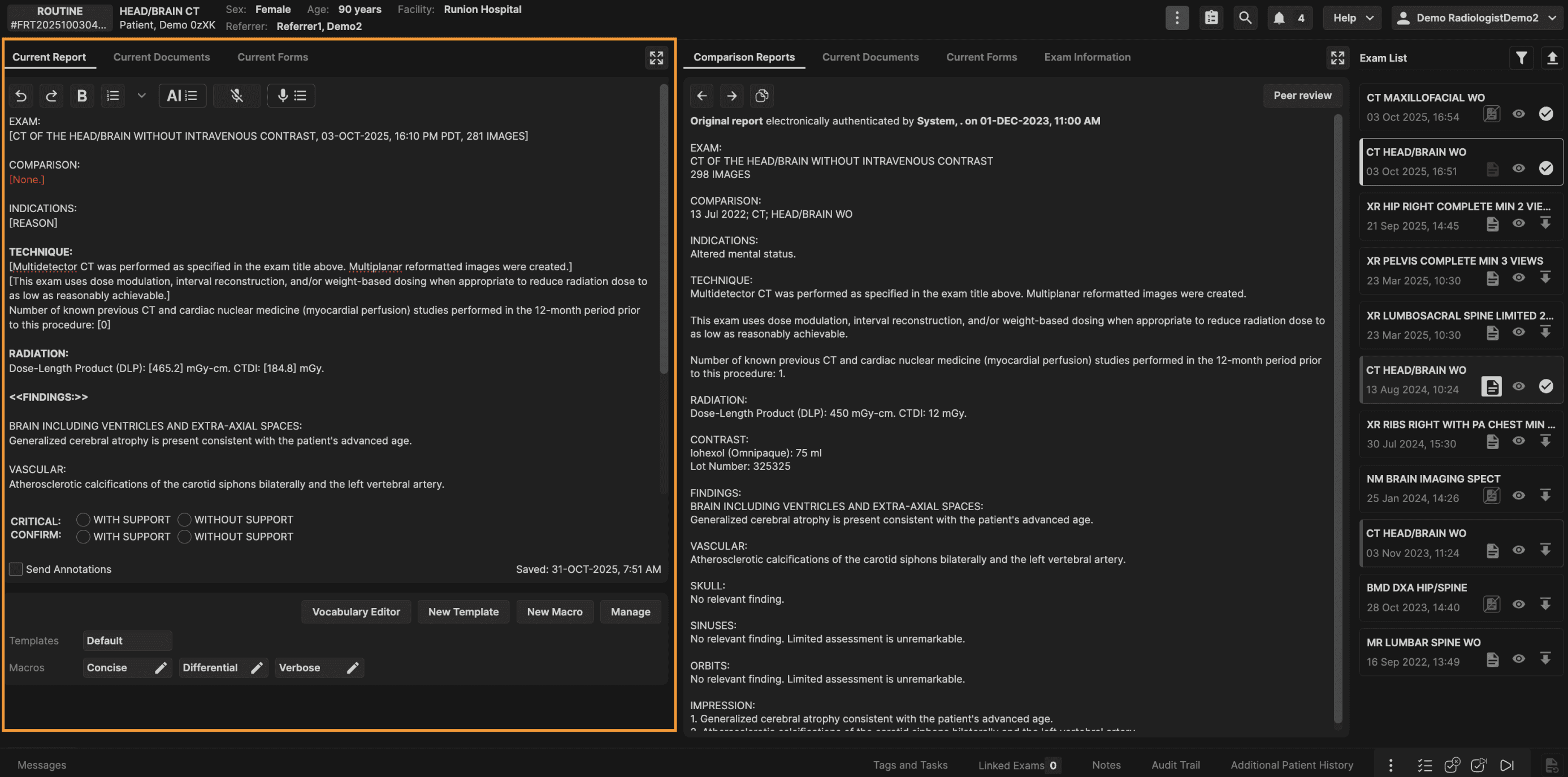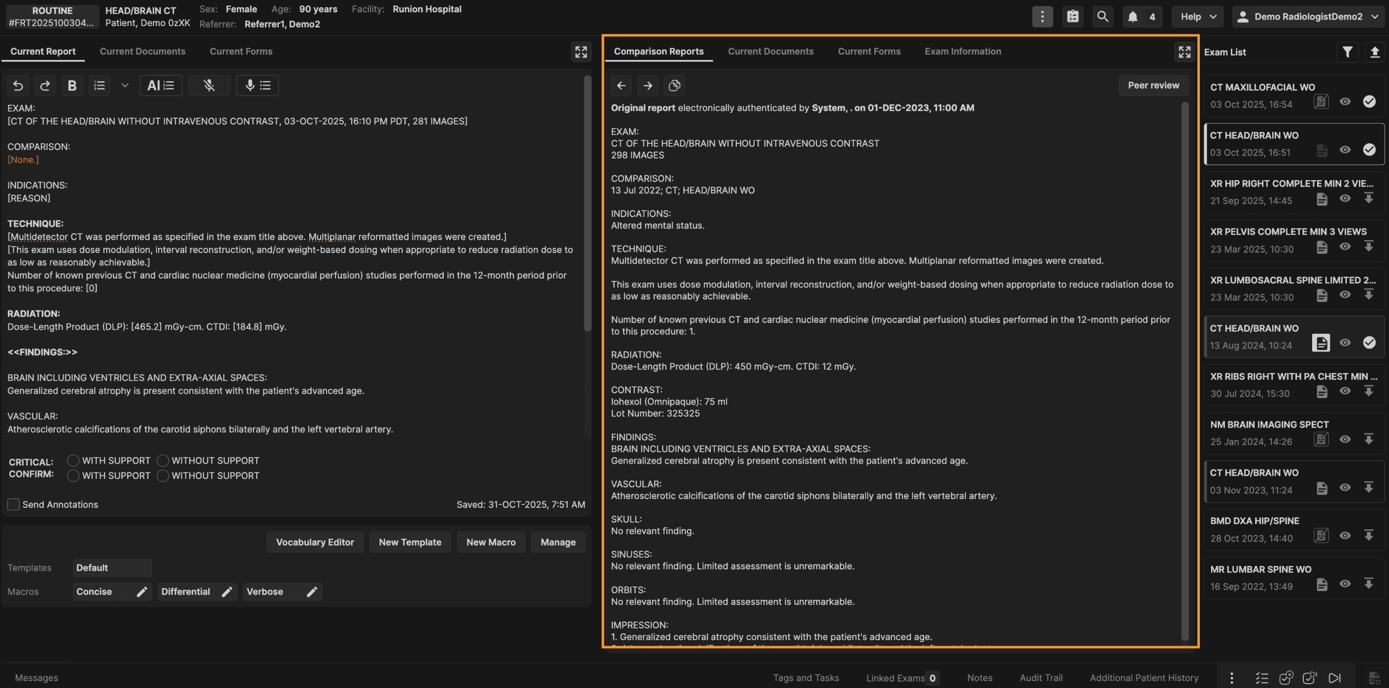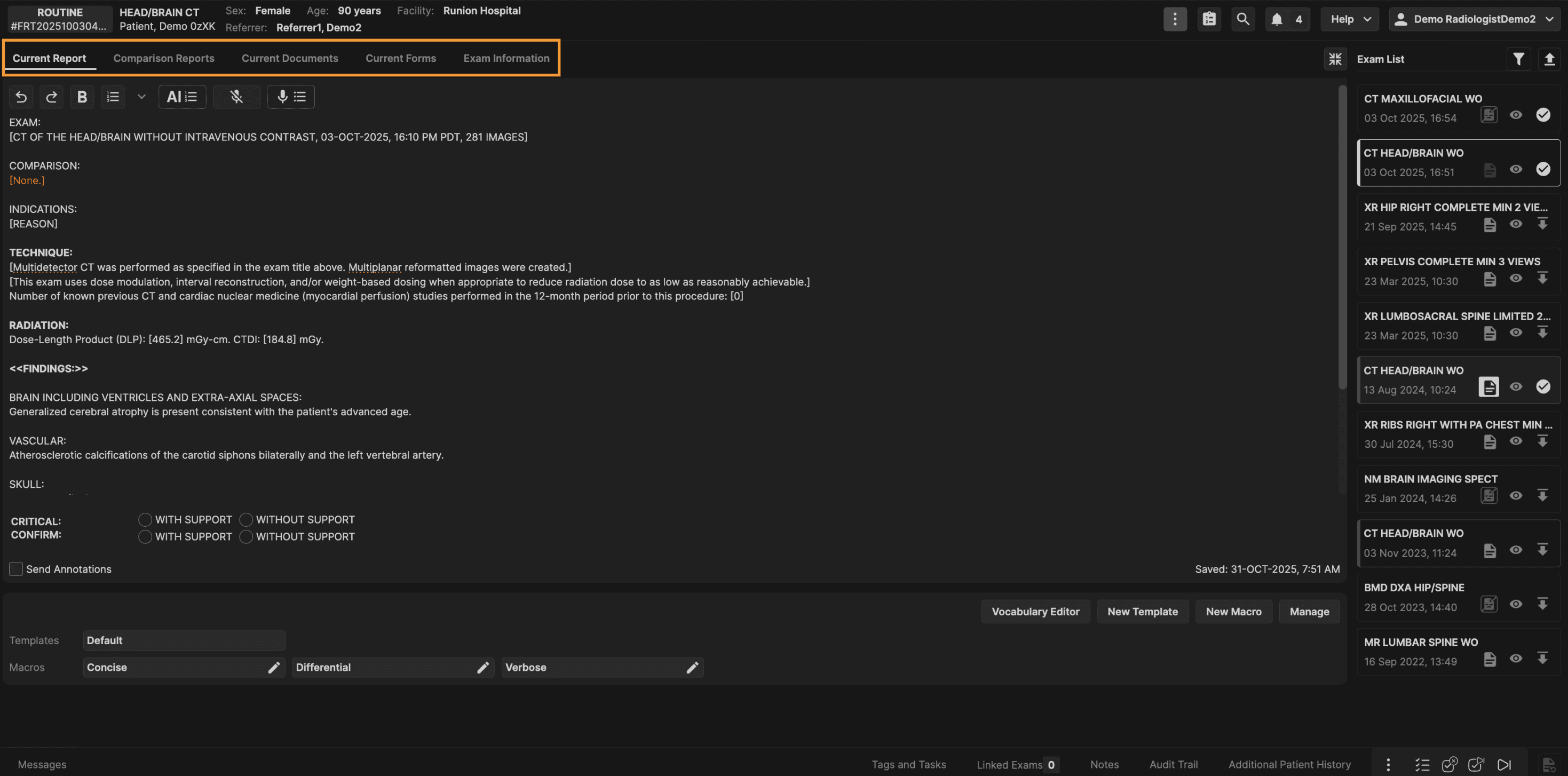 The Exam List panel is located on the right hand side of the reporting screen. The Exam List panel displays all prior exams for the current patient. | |