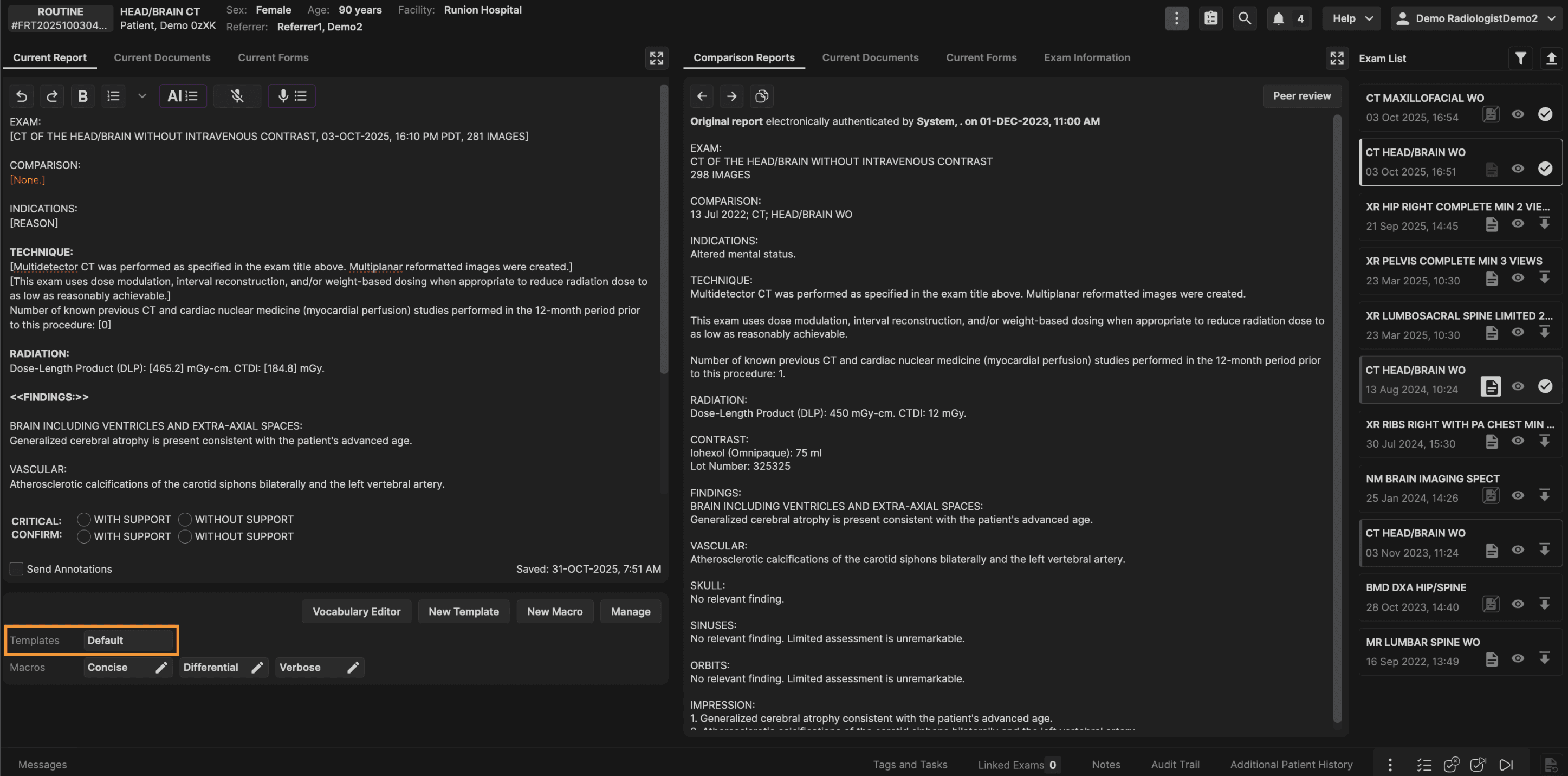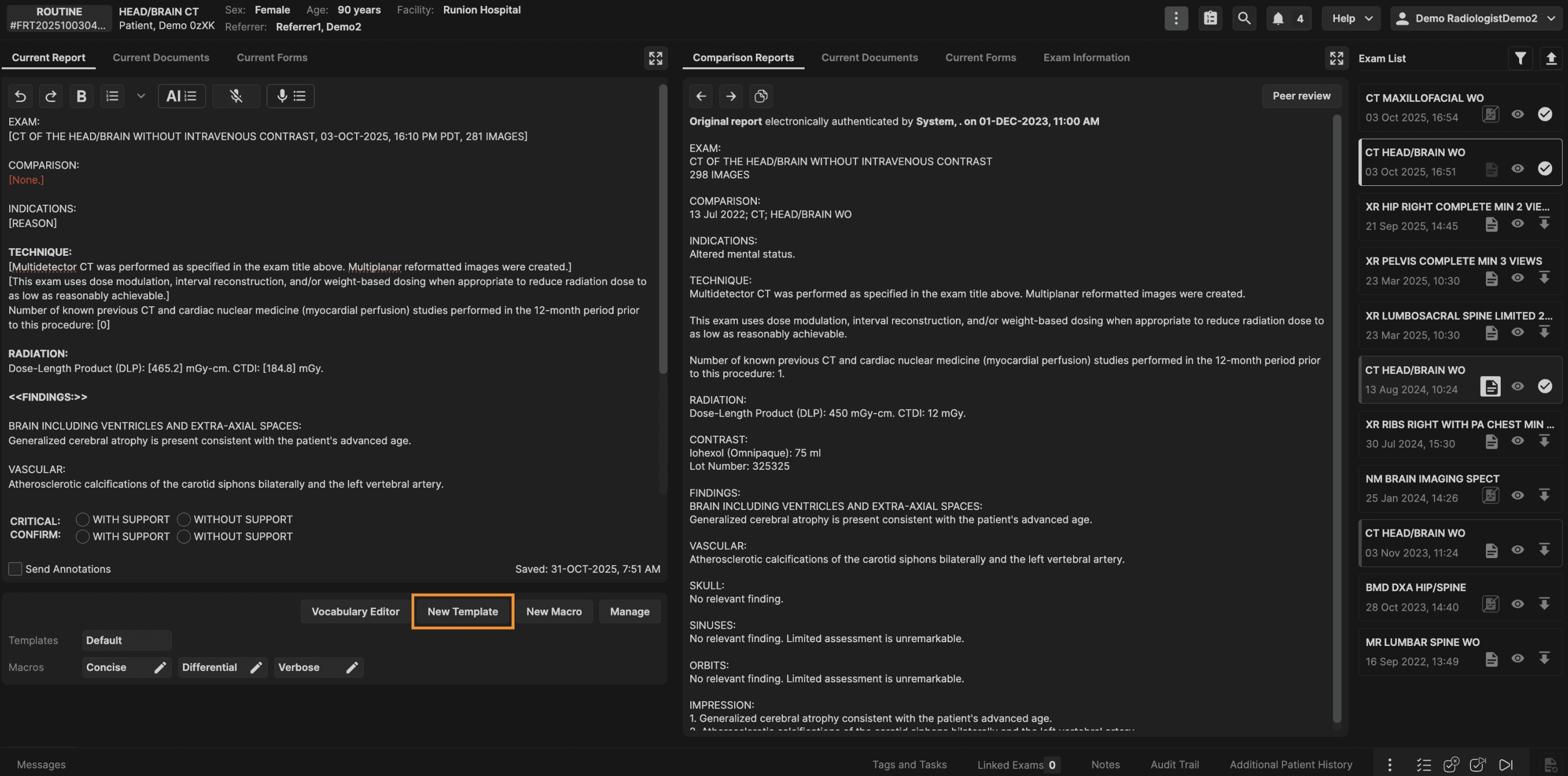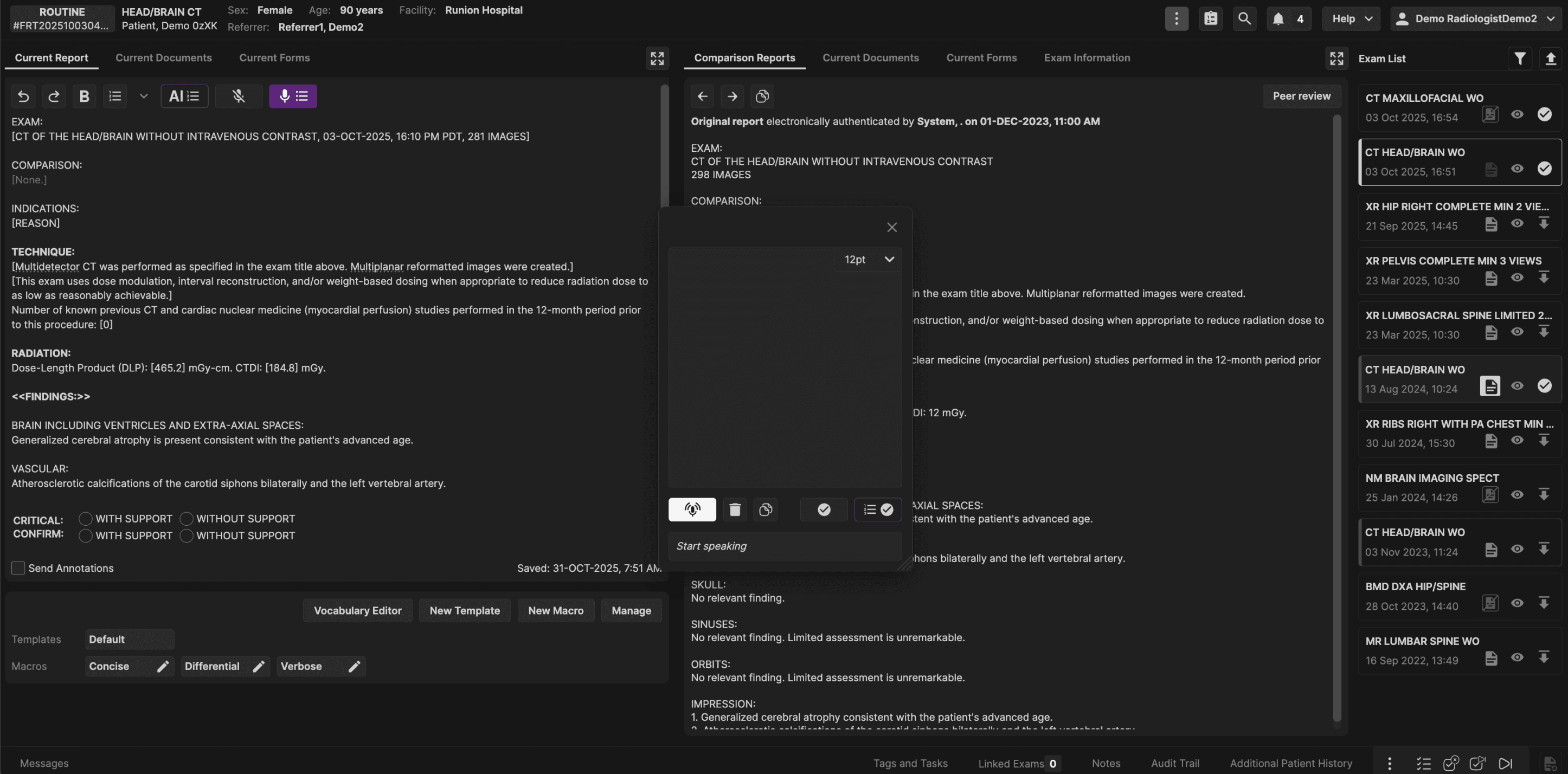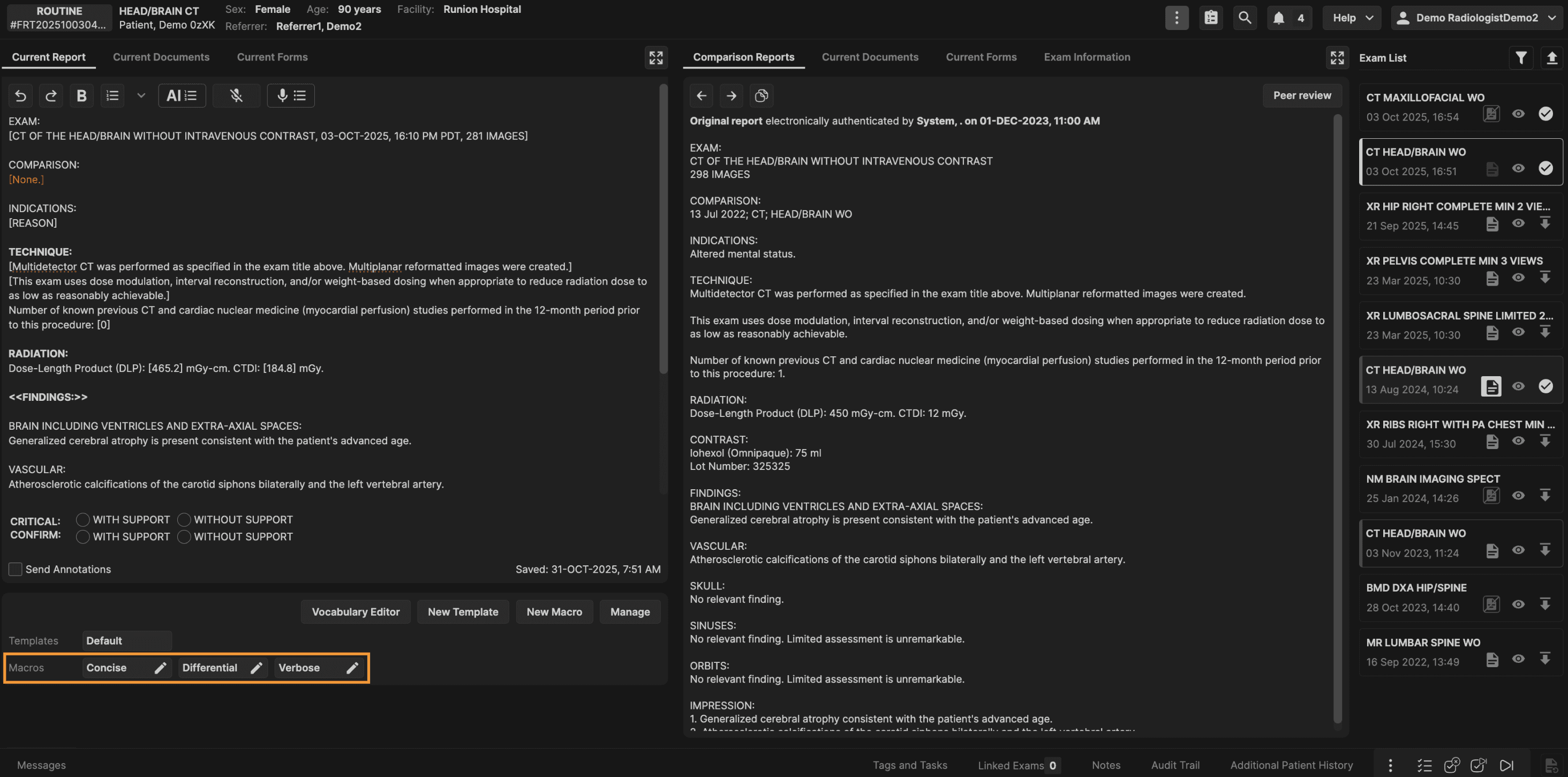 The Exam List panel is located on the right hand side of the reporting screen. The Exam List panel displays all prior exams for the current patient. | |
