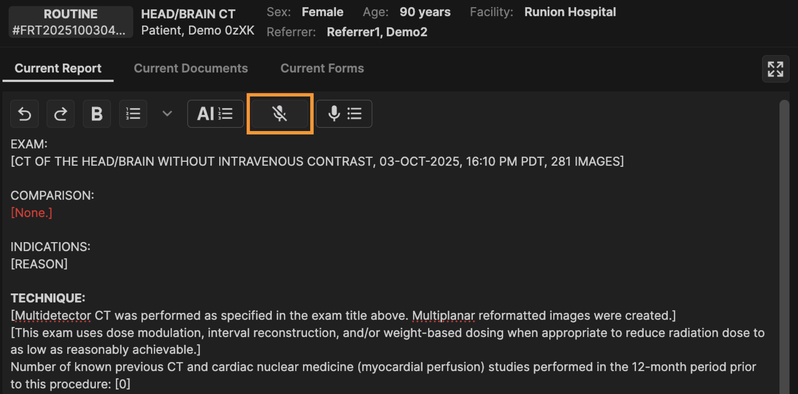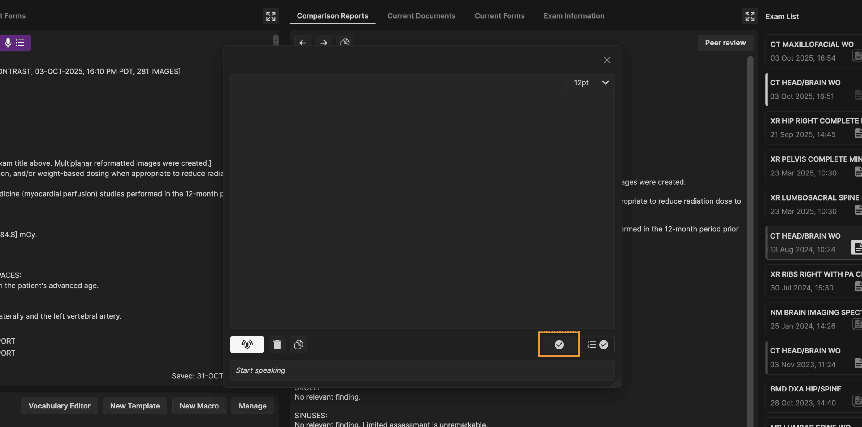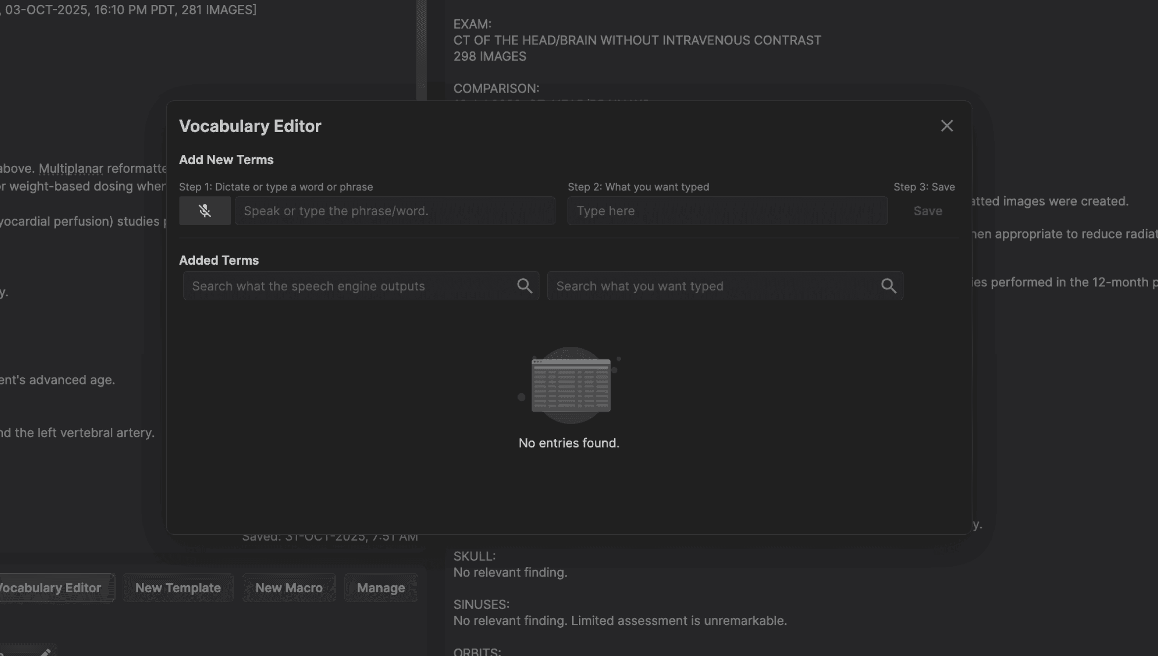 The "Vocabulary Editor" button opens a window to let you teach the system how to recognize and format medical terms and phrases accurately, ensuring consistent outputs like “5.6 cm” instead of “five point six centimeters.” By adding custom terms and pronunciations, the speech-to-text engine learns your specific vocabulary, improving accuracy over time. | |