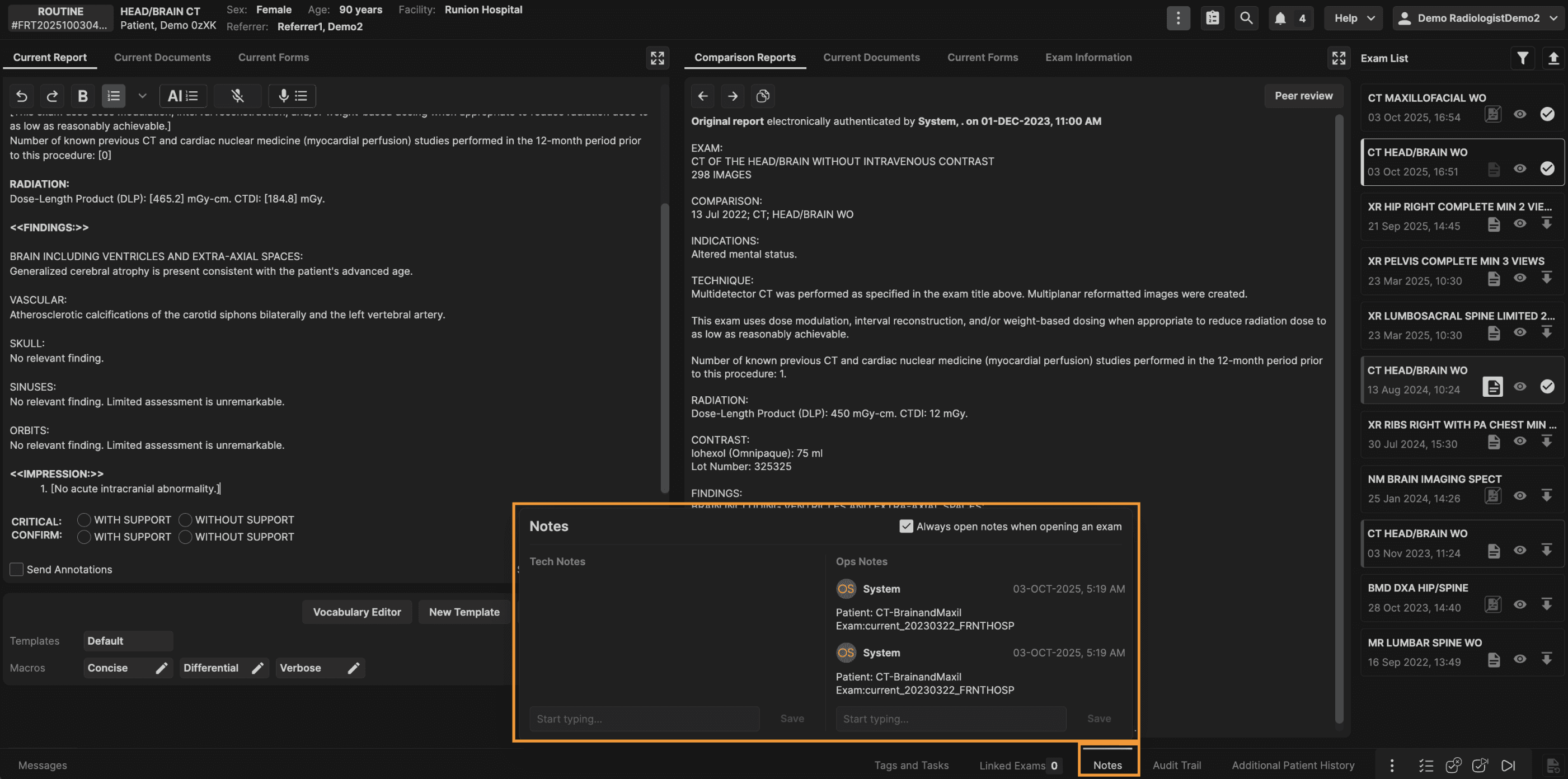 Click on the "Notes" option at the bottom ribbon to view technologist and operational notes. | |