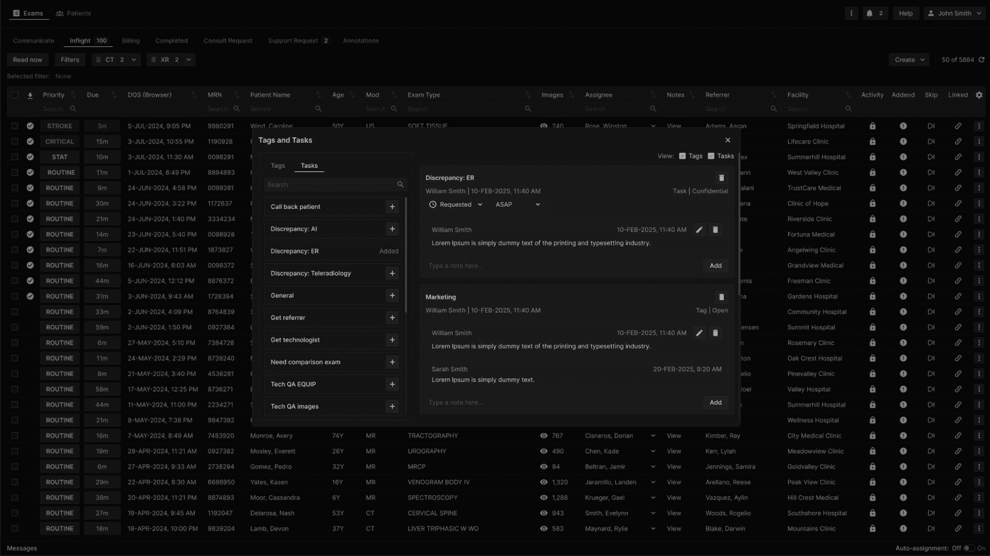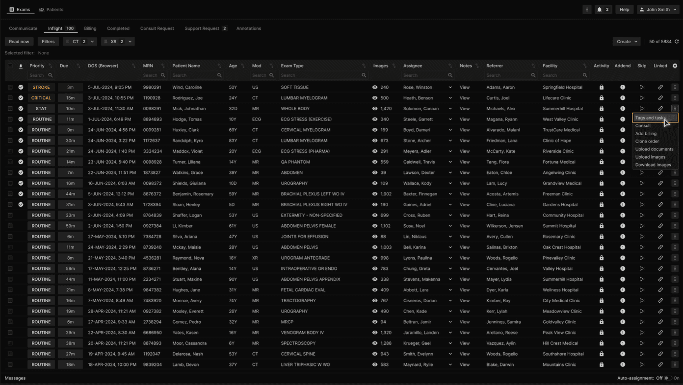 To view Tags or Tasks related to an exam in the Exams list, click on the three-dotted menu button at the right of a row or right click on the row. Available in the following tabs: Communicate, Pending, Inflight, Completed, Consult Request, Support Request, and Unmatched. | |