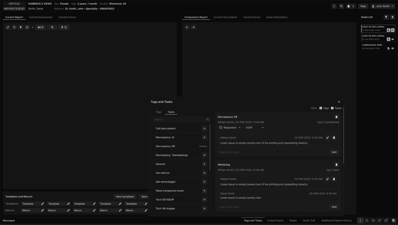 Tags and tasks: Access tags and tasks from the exam list or reporting screen