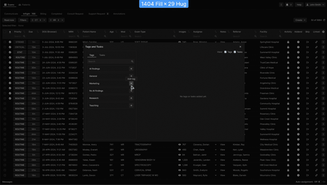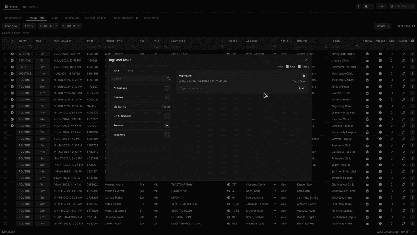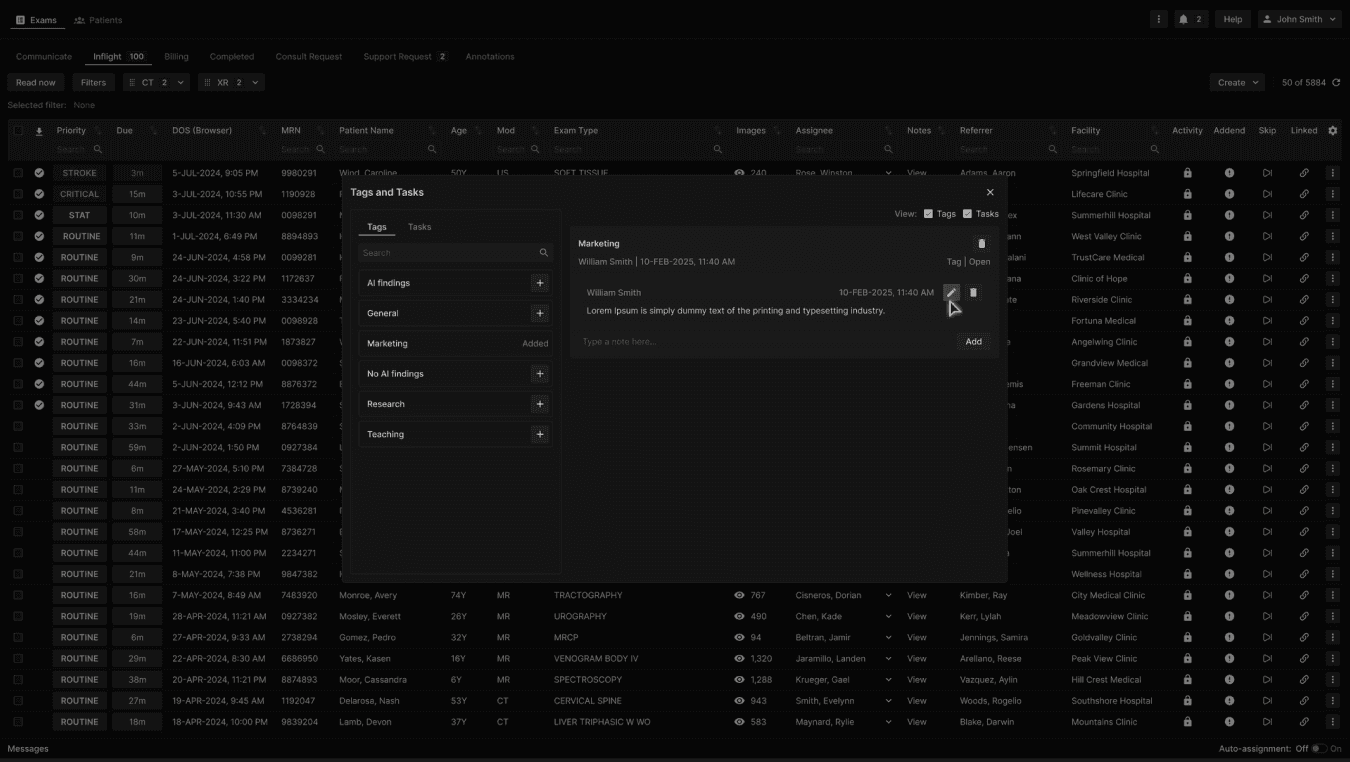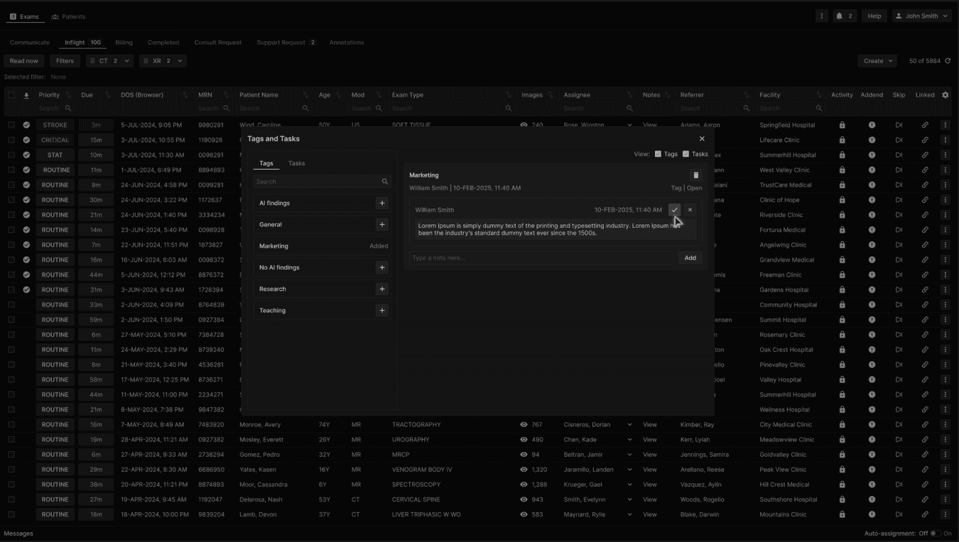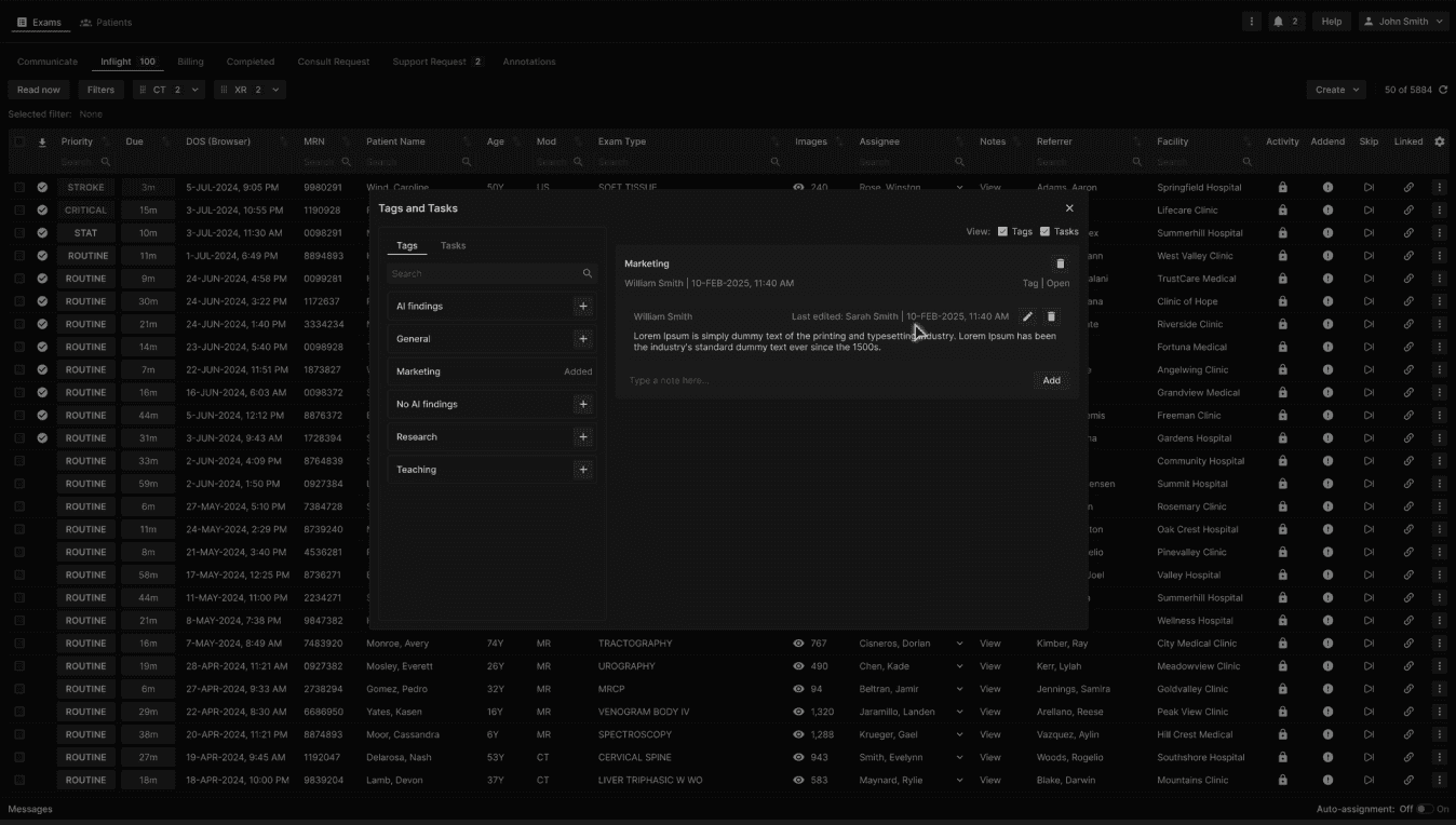 An exam may have one or more Tags and Tasks, each appearing at the right side of the Tags and Tasks dialog. The more recent Tag or Task appears on top. | |