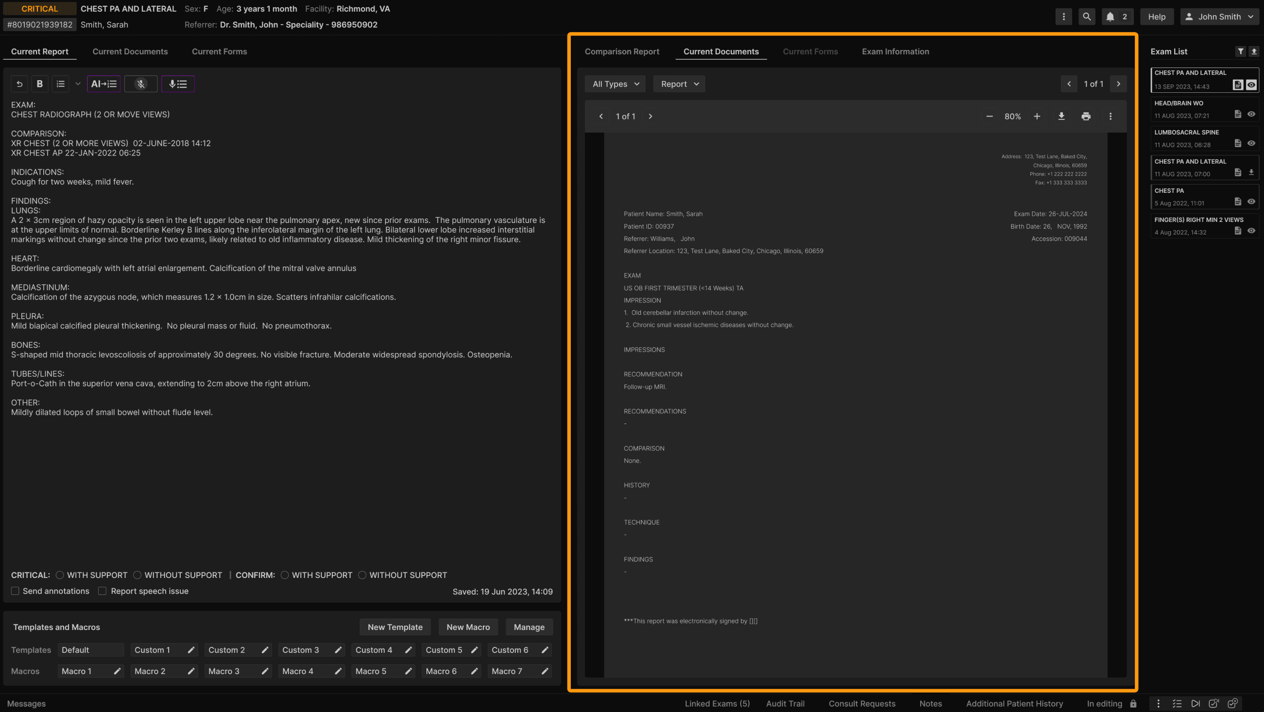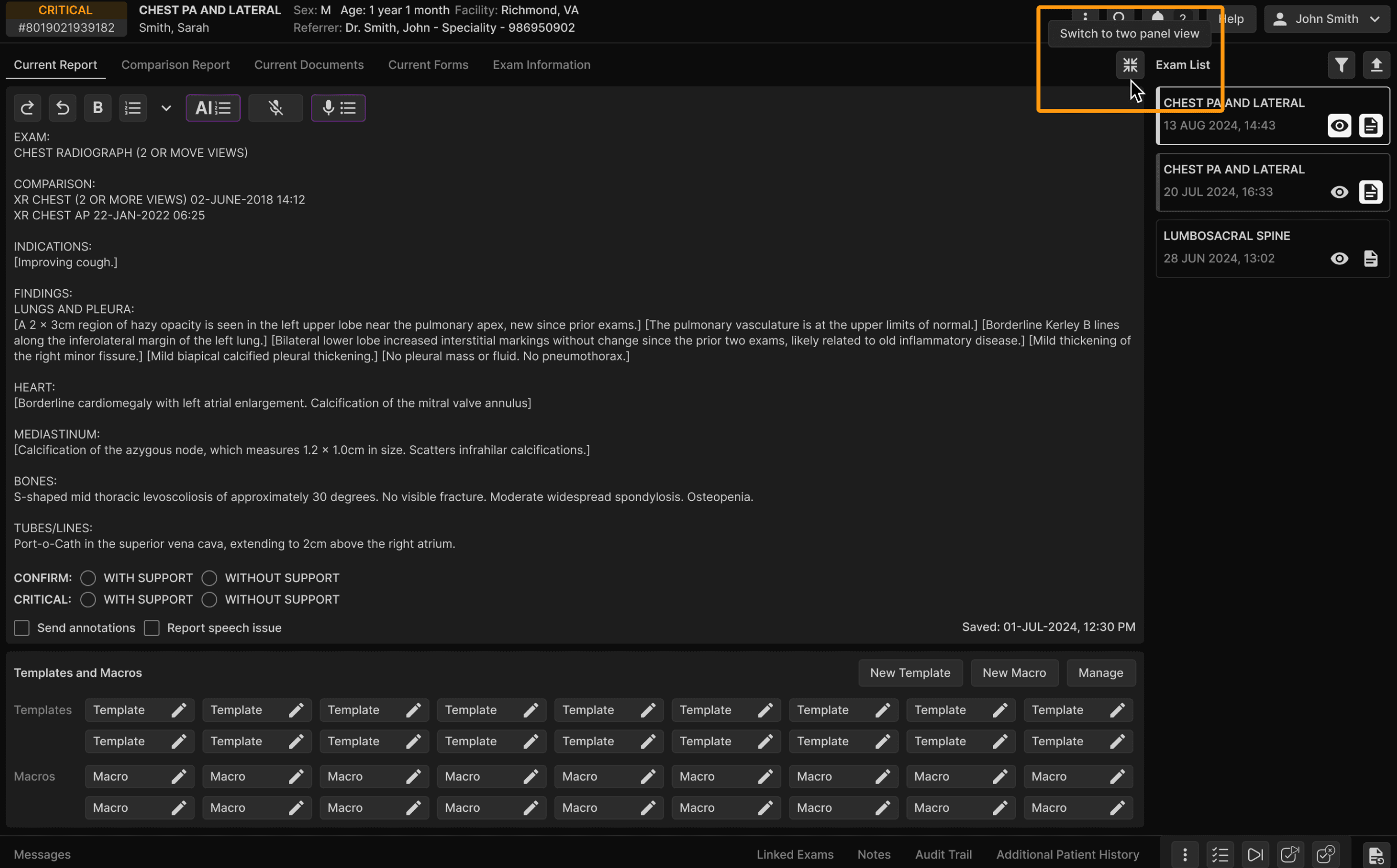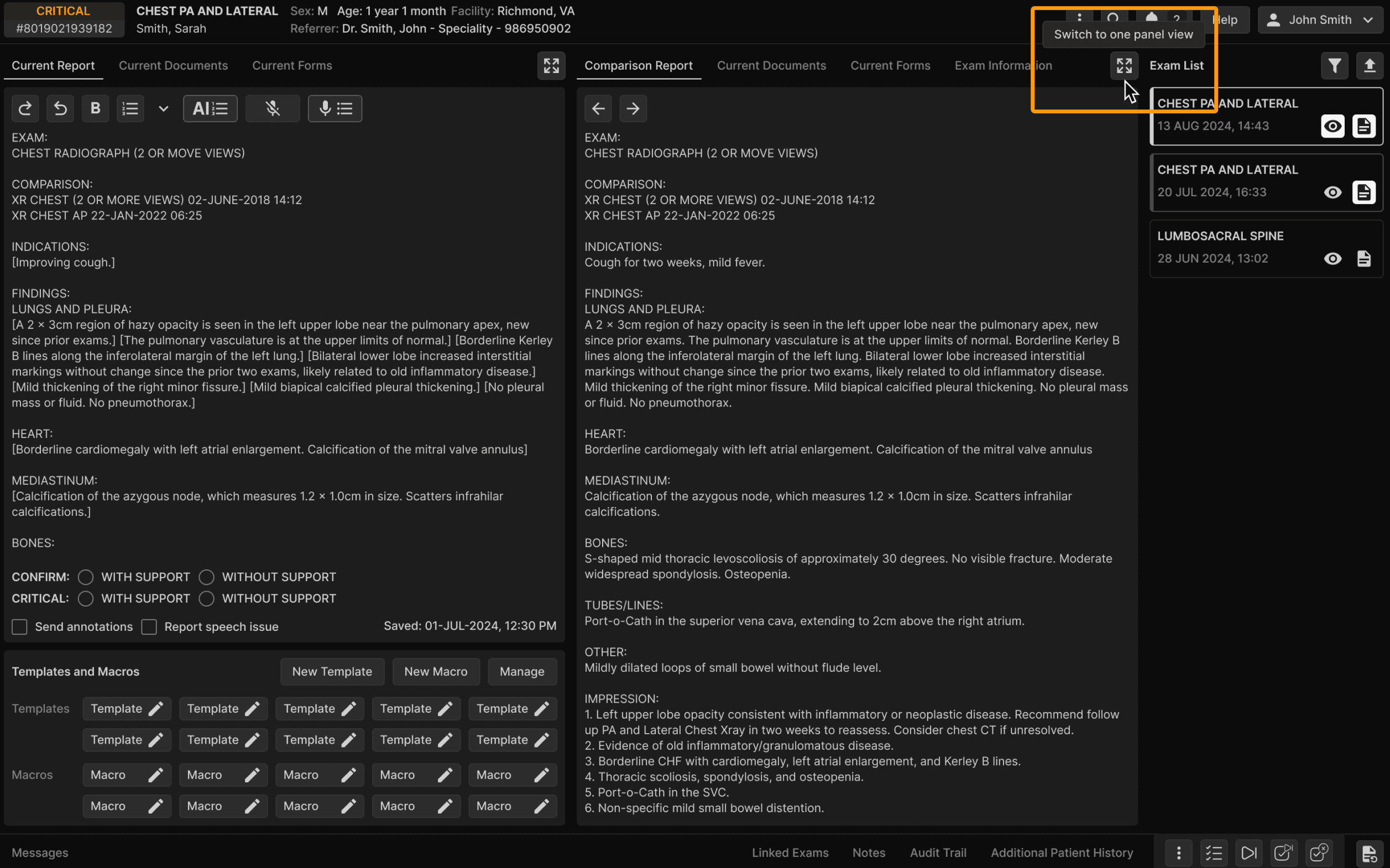 Opportunity: Users who frequently work with forms and/or reports in the exam details screen need a more flexible layout to view more data at once. The current double-panel view limits visibility and efficiency. | ||