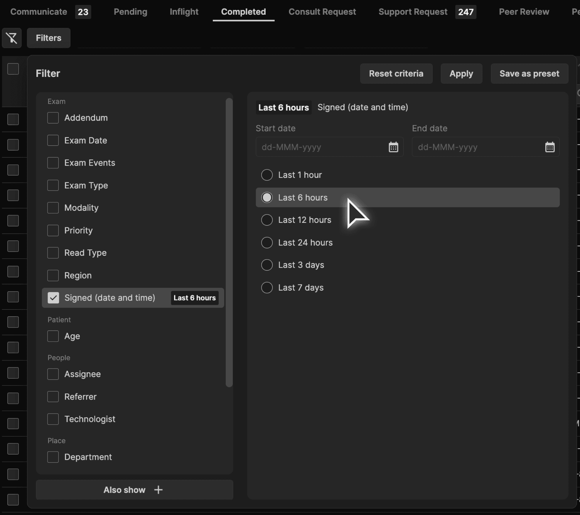 Solution: A new "Signed (date and time)" filter has been added to the Completed tab in the exam worklist: