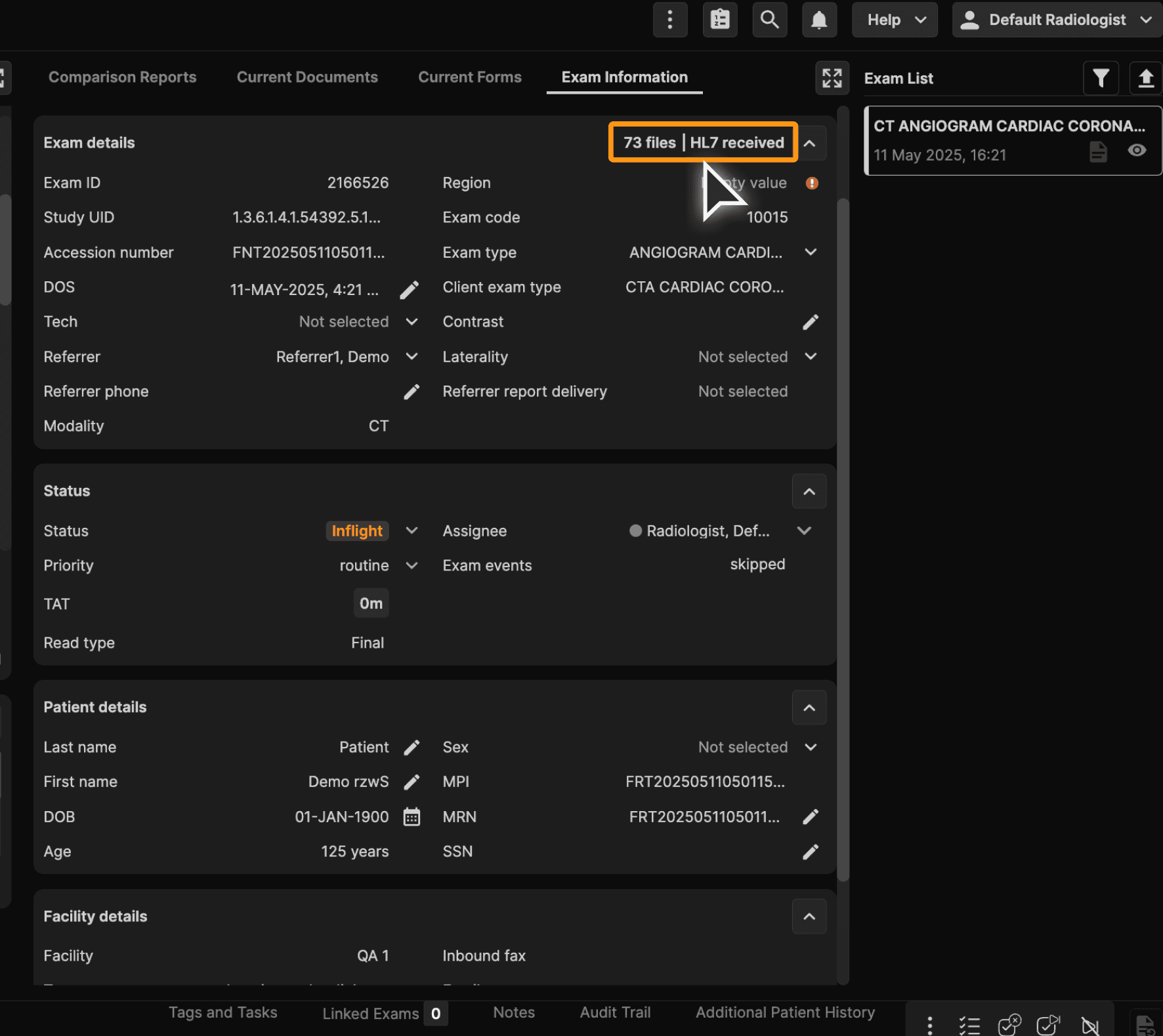 Solution: A new HL7 Message view has been added to the Exam Information tab -> Exam details section: